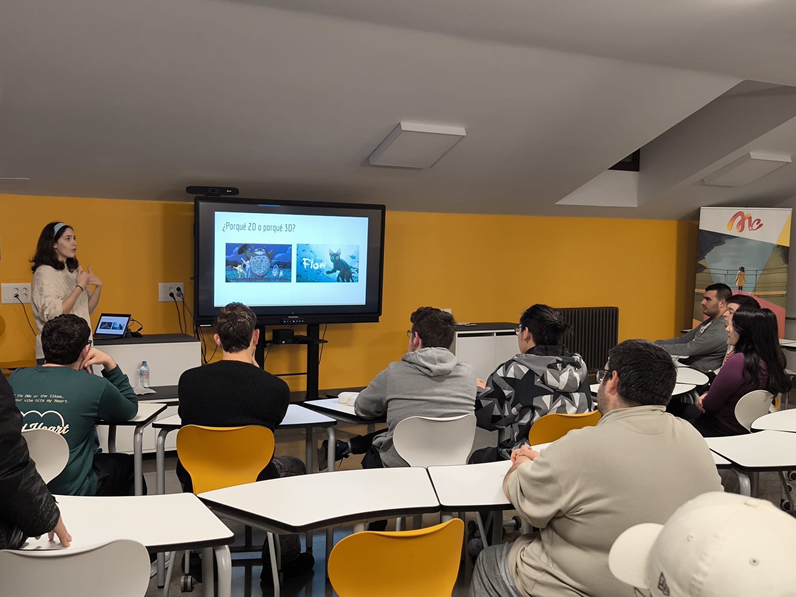 La sesión concluyó con una reflexión muy clara para el alumnado: el trabajo no cae del cielo. La animación es una profesión que exige dedicación, disciplina y compromiso a largo plazo, pero también ofrece oportunidades reales a quienes mantienen la pasión, el foco y la continuidad en su trabajo. También destacó la importancia de darse a conocer, construir una presencia profesional y entender el valor de los contactos y las redes como parte del camino hacia la industria.
